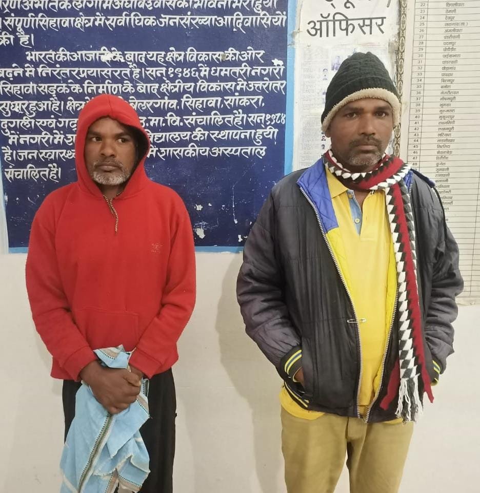 अवैध प्रेम संबंध व पारिवारिक विवाद बना हत्या के प्रयास की वजह – थाना सिहावा पुलिस ने किया सनसनीखेज मामले का खुलासा, दन्तेश्वरी तालाब पचरी में जानलेवा हमला – हथौड़े से वार करने वाले दो आरोपी गिरफ्तार, जेल भेजे गए , सिहावा पुलिस की त्वरित कार्यवाही – हत्या के प्रयास में शामिल दो आरोपी गिरफ्तार, हथियार जप्त, एसपी धमतरी के निर्देश पर थाना प्रभारी सिहावा द्वारा थाना सिहावा क्षेत्र अंतर्गत ग्राम सांकरा में घटित हत्या के प्रयास के गंभीर प्रकरण में त्वरित व प्रभावी कार्यवाही करते हुए एक सप्ताह के भीतर घटना का खुलासा कर दो आरोपियों को गिरफ्तार कर न्यायिक रिमांड पर जेल भेजा गया है।