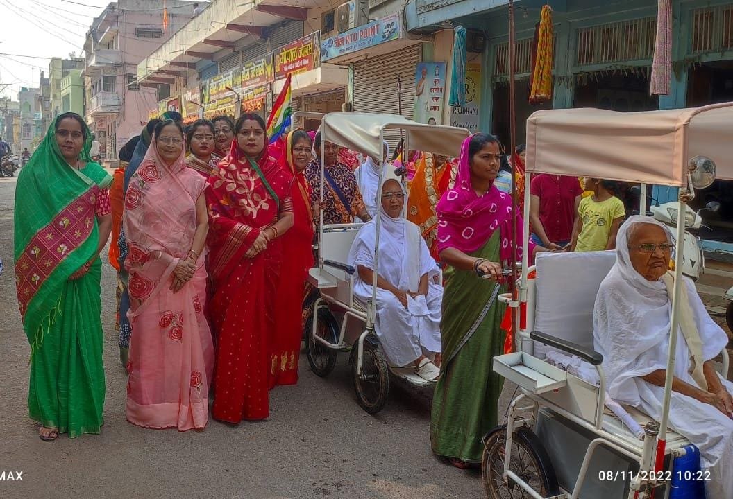 धमतरी । चातुर्मास के तहत आचार्य भगवंत परम पूज्य श्री पूर्णानंद सागर सूरीश्वर जी म. सा. एवं छत्तीसगढ़ रत्न शिरोमणि महत्ता पद विभूषिता परम पूज्य मनोहर श्री जी म. सा. की सुशिष्याए प. पू. तरुण प्रभा श्री जी म. सा. प्रखर व्याख्यानी प. पू. सुमित्रा श्री जी म. सा., प. पू. प्रिय मित्रा श्री जी म. सा., प. पू. मधु स्मिता श्री जी म. सा. आदि ठाणा का धमतरी आगमन हुआ था, आचार्य भगवंत एवं साध्वी वृंदों की निश्रा में कार्तिक पूर्णिमा के अवसर पर शोभायात्रा में वंदन अभिनंदन करने विधायक रंजना डीपेंद्र साहू पहुंची, आशीर्वाद प्राप्त कर समस्त समाज जनों के साथ शोभायात्रा में सम्मिलित हुई।