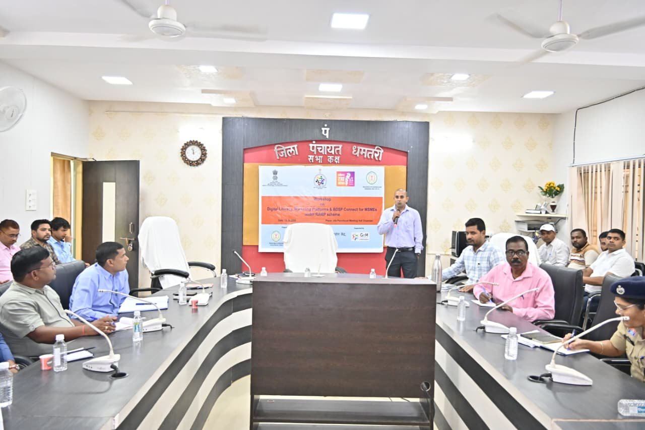 धमतरी | सूक्ष्म, लघु एवं मध्यम उद्यम (एमएसएमई), महिला उद्यमियों, स्व-सहायता समूहों (एसएचजी) एवं पारंपरिक कारीगरों को डिजिटल रूप से सशक्त बनाने तथा उनके उत्पादों की बाजार पहुँच को राष्ट्रीय स्तर तक विस्तार देने के उद्देश्य से आज जिला पंचायत सभा कक्ष, धमतरी में एक दिवसीय कार्यशाला का आयोजन किया गया। यह कार्यशाला भारत सरकार की रैम्प (Raising and Accelerating MSME Performance) योजना के अंतर्गत “ई-मार्केटप्लेस एवं डिजिटल मार्केटिंग के माध्यम से बाजार पहुँच विकास” विषय पर आयोजित की गई।