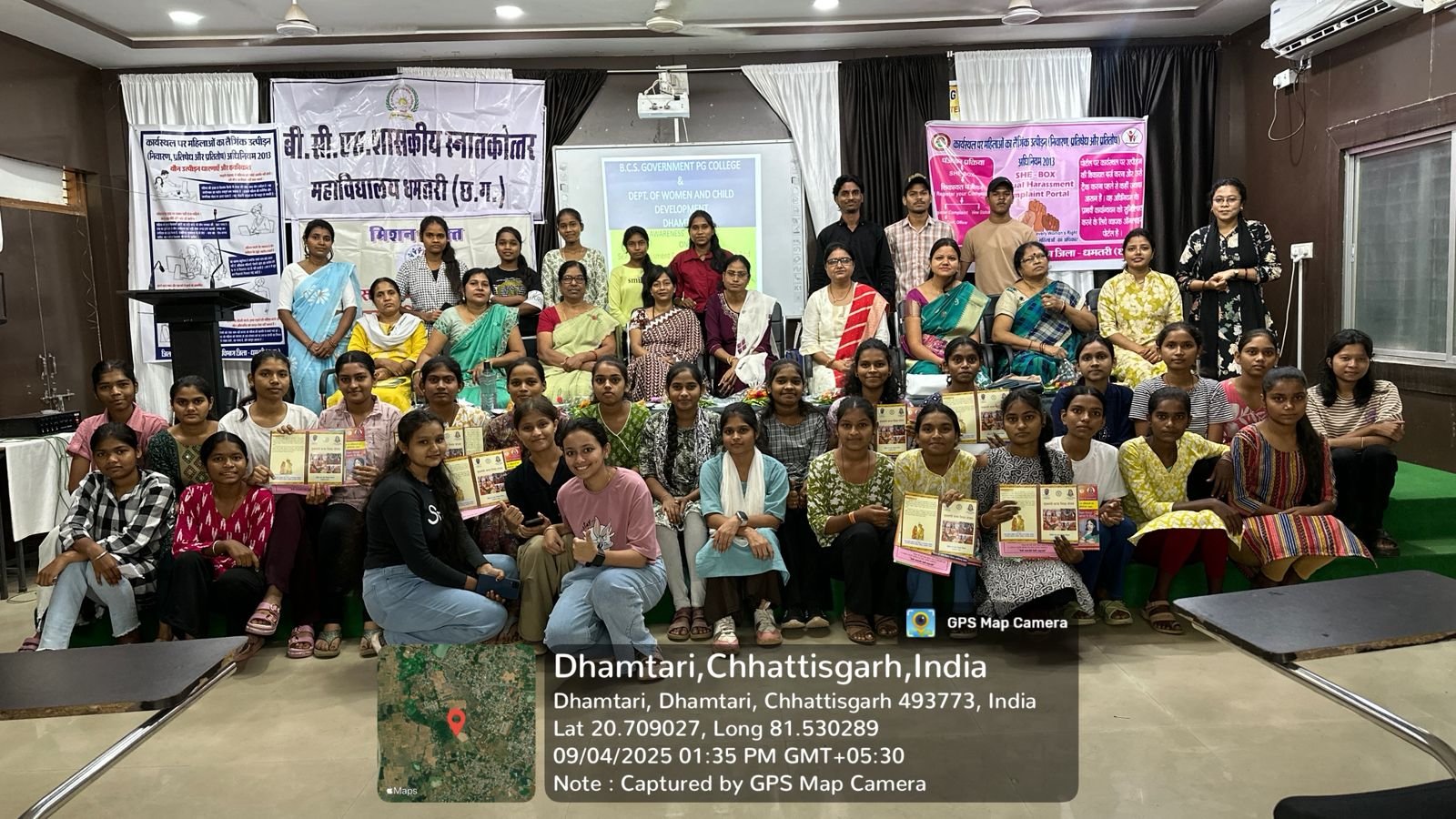 धमतरी | कलेक्टर श्री अबिनाश मिश्रा के निर्देशानुसार एवं जिला कार्यक्रम अधिकारी तथा जिला महिला एवं बाल विकास अधिकारी के मार्गदर्शन में शासकीय स्नातकोत्तर महाविद्यालय धमतरी में महिलाओं का कार्यस्थल पर लैंगिक उत्पीड़न (प्रतिषेध, प्रतितोष एवं निवारण) अधिनियम 2013 पर कार्यशाला का आयोजन किया गया।