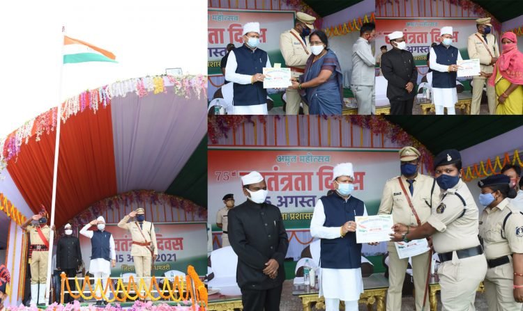 धमतरी | राष्ट्रीय पर्व स्वतंत्रता दिवस के 75 वें समारोह के मौके पर जिला मुख्यालय के डॉ.शोभाराम देवांगन शासकीय उच्चतर माध्यमिक विद्यालय स्थित एकलव्य खेल परिसर में मुख्य समारोह आयोजित किया गया। इस कार्यक्रम में बतौर मुख्य अतिथि संसदीय सचिव, पंचायत एवं ग्रामीण विकास, लोक स्वास्थ्य एवं परिवार कल्याण, चिकित्सा शिक्षा, बीस सूत्रीय कार्यान्वयन, वाणिज्यिक कर (जीएसटी) श्री विनोद सेवनलाल चन्द्राकर द्वारा ठीक सुबह नौ बजे ध्वजारोहण किया गया। मौके पर 6 प्लाटून द्वारा गार्ड ऑफ ऑनर दिया गया। कार्यक्रम में राष्ट्रगान गाया गया इसके बाद प्रदेश के राजकीय गीत हुआ। इसके बाद मुख्य अतिथि को छह प्लाटून द्वारा सलामी दी गई। संसदीय सचिव द्वारा इस अवसर पर सुबह सवा नौ बजे प्रदेश के मुख्यमंत्री श्री भूपेश बघेल का जनता के नाम संदेश का वाचन किया गया। इसके साथ ही हर्ष के प्रतीक रंग-बिरंगे गुब्बारे आसमान में छोड़े गए।