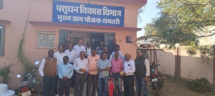 धमतरी। पशु चिकित्सक के रूप में पूरे ब्लॉक के स्तर पर विशेषकर ग्रामीण क्षेत्रों में अपनी सेवा गर्मी, सर्दी तथा बरसात के विपरीत परिस्थितियों में 24 घंटा दे रहे चिकित्सकों जिनके कारण ही पूरे छत्तीसगढ़ में नस्ल सुधार अभियान में धमतरी जिला नंबर वन पर है ,का सम्मान शहर के समाजसेवी एवं धर्म प्रेमी पंडित राजेश शर्मा द्वारा किया गया पहली बार उनका सार्वजनिक रूप से हुए सम्मान से वे काफी अभिभूत नजर आए तथा उन्होंने रूधे स्वर में कहा कि हमारी सेवा व तप को पहचान आज प्राप्त हुई है।