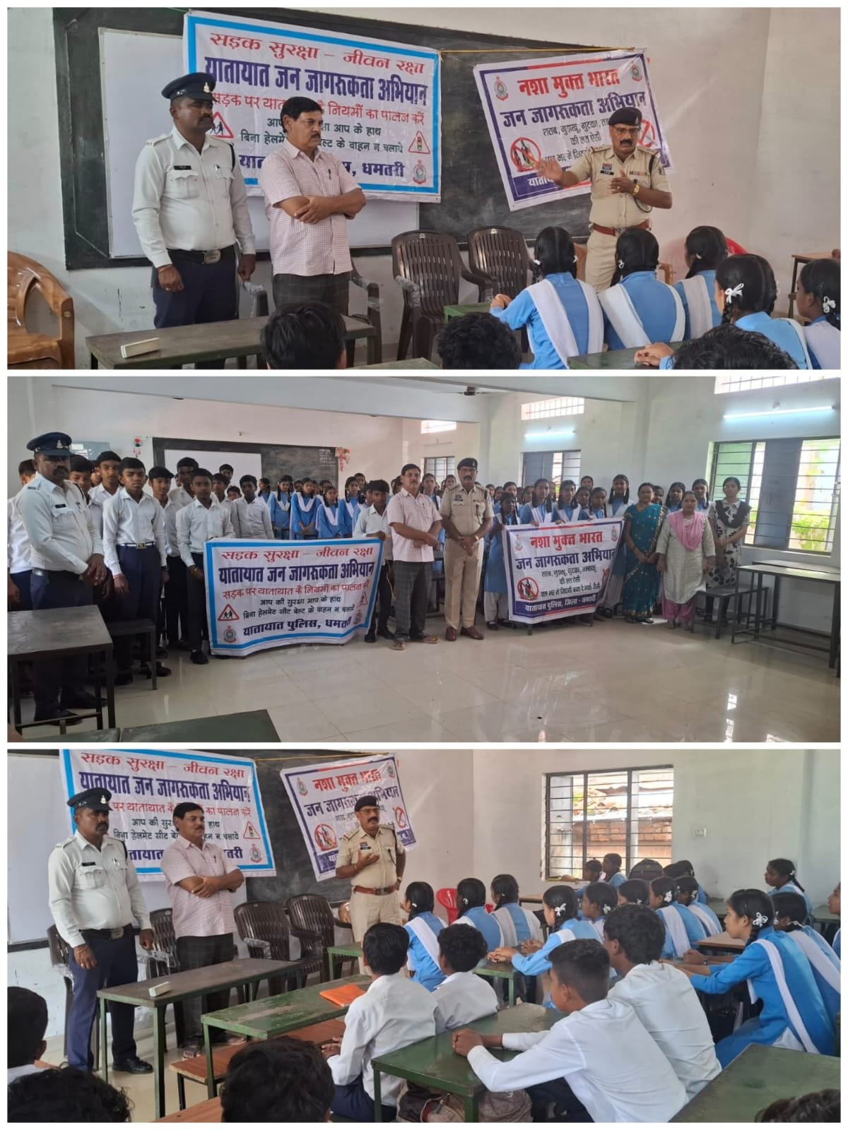 धमतरी | पुलिस यातायात द्वारा 106 छात्र-छात्राओं को यातायात नियमों की दी गई व्यवहारिक जानकारी, एसपी. धमतरी के निर्देशानुसार एवं उप पुलिस अधीक्षक यातायात के नेतृत्व में आज दिनांक 19 जुलाई 2025 को ग्राम पोटियाडीह स्थित शासकीय हाई स्कूल में यातायात जागरूकता कार्यक्रम आयोजित किया गया। कार्यक्रम में यातायात प्रभारी उनि. श्री खेमराज साहू द्वारा स्कूल के 106 छात्र-छात्राओं एवं शिक्षकगण को सड़क सुरक्षा एवं यातायात नियमों की जानकारी दी गई। विद्यार्थियों को बताया गया कि: