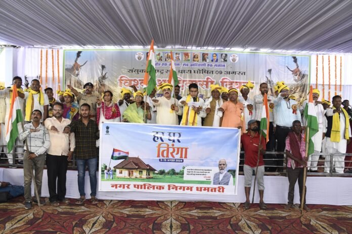 इस अवसर पर प्रभारी मंत्री श्री वर्मा ने विश्व आदिवासी दिवस की शुभकामनायें देते हुए कहा कि आदिवासियों के मान सम्मान, एकजुटता, विकास दिखाने का दिन है। उन्होंने कहा कि आदिवासी जल, जंगल, जीवन के सही मायने में रखवाले है। वर्मा ने आदिवासियों के लिए संचालित योजनाओं पीवीटीजी विशेष पिछड़ी जनजाति के संबंध में जानकारी दी। उन्होंने कहा कि शहरों की तरह अब गांवों में भी सुविधाएं दी जायेंगी। ऐसा अवसर एक दूसरे के साथ जुडने व जानने समझने के लिए होता है। एक दूसरे से जुड़ेंगे तो समाज के बारे में जानकारी मिलेगी, समस्या या सुझाव मिलेंगे जिससे समाज की बेहतरी के लिए रास्ते निकलेंगे। उन्होंने कहा कि अपनी समस्या या बात रखने में संकोच न हो। अपनी बोली भाषा में भी बिना झिझक के समस्या या सुझाव के बारे में बता सकते हैं। समाज के विकास के लिए नवाचार पहल होनी चाहिए जिससे प्रशासन के सहयोग से आगे बढ़ाया जा सके। प्रभारी मंत्री श्री वर्मा ने कार्यक्रम स्थल में लगे स्वास्थ्य, आयुर्वेद, आदिवासी विकास, स्कूल शिक्षा, कृषि, पशुधन, मछली पालन, वन, उद्योग, अंत्यवसाय विकास विभाग के स्टॉल का निरीक्षण किया। आदिवासी समाज की ओर से प्रभारी मंत्री को शॉल और स्मृति चिन्ह भेंट किया गया। कार्यक्रम को संबोधित करते हुए रामू रोहरा ने कहा कि प्रदेश के मुखिया श्री विष्णु देव साय के राज में सभी काम सांय सांय हो रहे हैं। उन्होंने कहा कि आदिवासी समाज की मांग को वे मुख्यमंत्री के समक्ष रखेंगे। मुख्यमंत्री द्वारा आदिवासियों को उनका हक जरूर दिया जाएगा। प्रभारी मंत्री श्री वर्मा ने दिलाई हर घर तिंरगा की शपथ विश्व आदिवासी दिवस के मौके पर आयोजित कार्यक्रम के दौरान प्रभारी मंत्री श्री टंकराम वर्मा ने 9 से 15 अगस्त तक मनाए जाने वाले हर घर तिरंगा के तहत शपथ दिलाई। शपथ में कहा गया कि मैं शपथ लेता हूं कि मैं तिंरगा फहराऊंगा। हमारे स्वतन्त्रता सेनानी और वीर सपूतों की आवाज का सम्मान करूंगा और भारत के विकास और प्रगति के प्रति स्वयं को समर्पित करूंगा।
