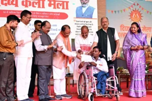 रायपुर । राजधानी में आयोजित दिव्य कला मेले में मुख्य अतिथि केन्द्रीय सामाजिक न्याय एवं आधिकारिता मंत्री श्री डॉ. वीरेन्द्र कुमार, मुख्यमंत्री श्री विष्णु देव साय ने भारत सरकार की संस्था एलिम्को द्रारा दिव्य कला मेले में दिव्यांगजन को प्रोत्साहित करने के लिए टोकन के रूप में सहायक उपकरण वितरित किए गए।