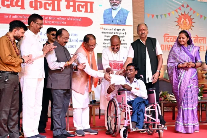 रायपुर । राजधानी में आयोजित दिव्य कला मेले में मुख्य अतिथि केन्द्रीय सामाजिक न्याय एवं आधिकारिता मंत्री श्री डॉ. वीरेन्द्र कुमार, मुख्यमंत्री श्री विष्णु देव साय ने भारत सरकार की संस्था एलिम्को द्रारा दिव्य कला मेले में दिव्यांगजन को प्रोत्साहित करने के लिए टोकन के रूप में सहायक उपकरण वितरित किए गए।