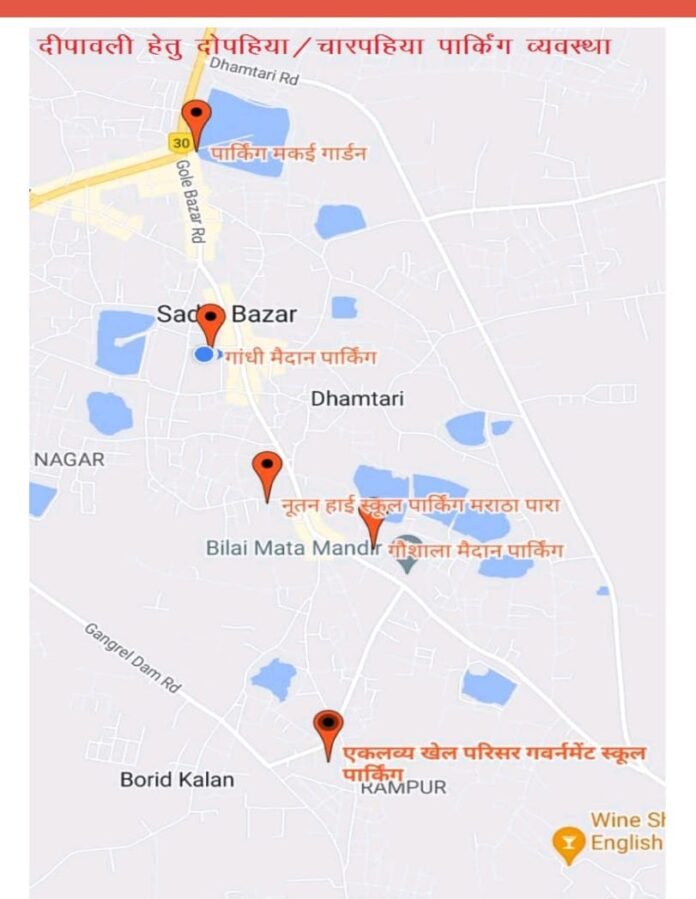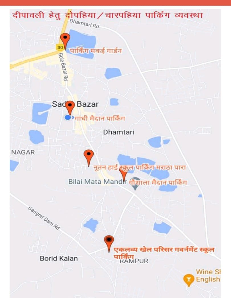 (04)- एकलव्य खेल परिसरः- रूद्री, गंगरेल, मरादेव, लक्ष्मी निवास, कर्मा चौक, के तरफ से आने वाले ग्राहक अपने वाहनों को एकलव्य खेल परिसर में पार्क करेगें। (05)- गौशाला मैदानः नहर नाका तरफ से आने वाले ग्राहक अपने वाहन को गौशाला मैदान में पार्क कर सकेगें। (06)- गुरूद्वारा गली, सराय मार्केटः शहर के अंदर से आने वाले दोपहिया वाहन चालक अपने वाहन को गुरूद्वारा गली एवं सराय मार्केट में पार्क कर सकेगें। दीपावली त्यौहार में सुगम बाधारहित यातायात व्यवस्था बनाने त्यौहारी सीजन में दिनांक 24. 10.2024 से 03.10.2024 तक प्रातः 10:00 बजे से रात्रि 09:00 बजे तक घड़ी चौक से विंध्यवासिनी मंदिर तक चार पहिया वाहनों के आवागमन पर प्रतिबंध लगाया गया है, चारपहिया वाहन चालक असुविधा से बचने के लिए अपने वाहनों को मकई गार्डन पार्किंग, एकलव्य खेल परिसर, गौशाला मैदान गांधी मैदान धमतरी में पार्किंग करें। गुरुद्वारा गली, सराय मार्केट, नूतन स्कूल में केवल दोपहिया वाहनों के लिए पार्किंग व्यवस्था रहेगी। समस्त शहरवासियों से अपील किया जाता है की दीपावली त्यौहार में सुगम बाधारहित यातायात व्यवस्था बनाने यातायात पुलिस धमतरी का सहयोग करें।
