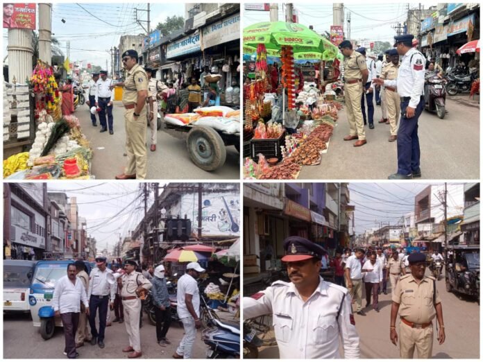 धमतरी l धमतरी पुलिस यातायात उप पुलिस अधीक्षक श्री मणिशंकर चन्द्रा के द्वारा हमराह स्टॉफ व नगर निगम टीम के शहर के सदर मार्ग में त्यौहारी सीजन होने से यातायात का दबाव अत्यधिक होने से यातायात व्यवस्थित करने घड़ी चौक से कचहरी ढलान तक एवं बालक चौक से आमापारा तक पैदल पेट्रोलिंग करते हुए दुकान के बाहर निकालकर सामान फैलाने वालों दुकानदारों को समझाईश देकर दुकान के सामानों को अदंर कराया गया।