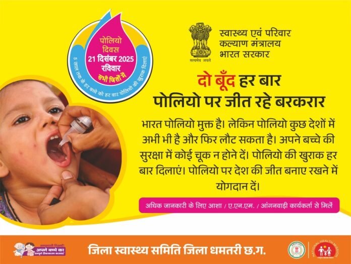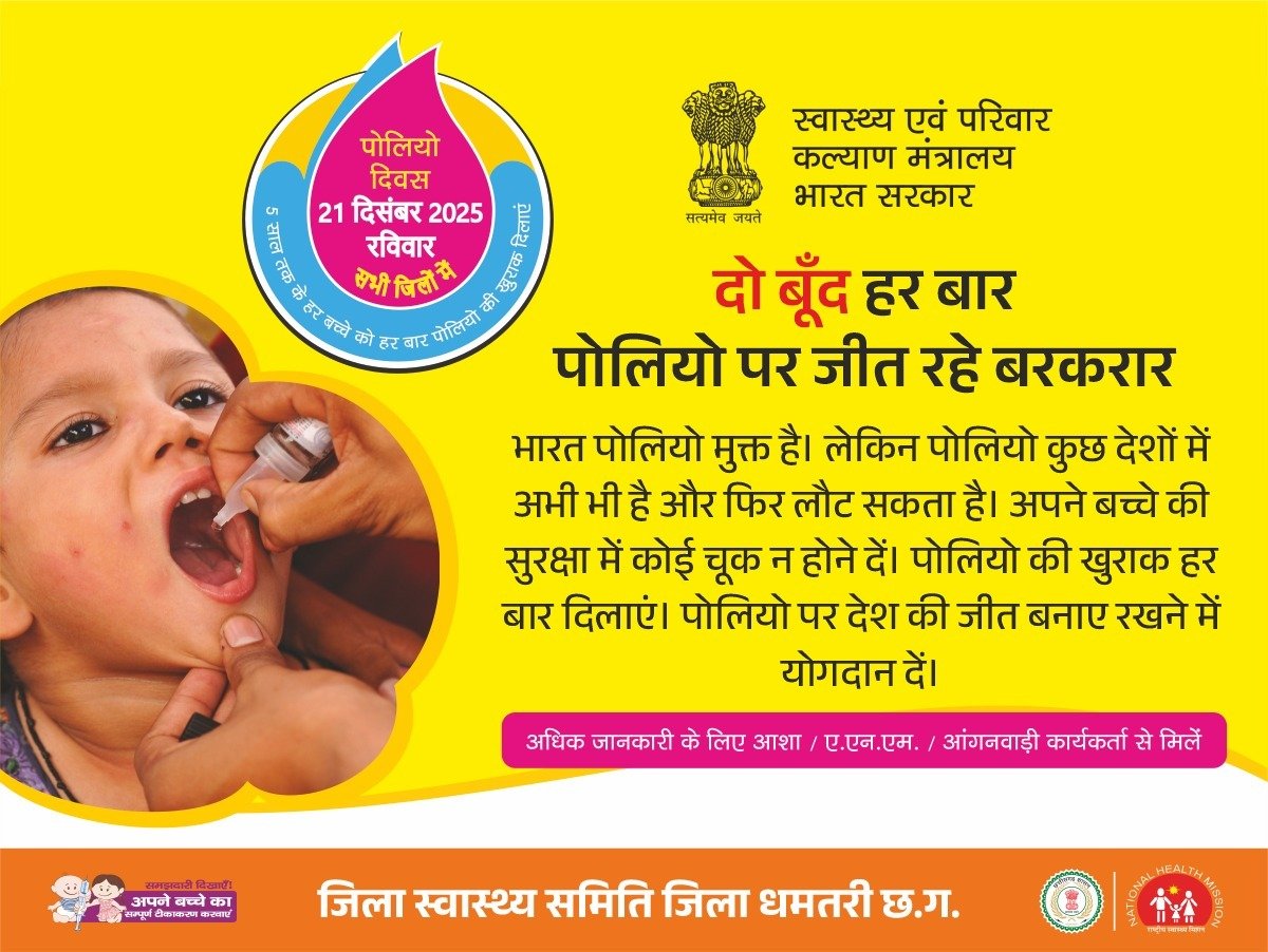 धमतरी | धमतरी जिले में बच्चों को पोलियो जैसी गंभीर बीमारी से सुरक्षित रखने हेतु पल्स पोलियो प्रतिरक्षण अभियान का आयोजन 21 दिसम्बर 2025 को किया जाएगा। इस अभियान के अंतर्गत जिले के 0 से 5 वर्ष आयु वर्ग के सभी बच्चों को सुबह 8 बजे से शाम 5 बजे तक उनके निकटतम निर्धारित पोलियो बूथ पर पोलियो की खुराक पिलाई जाएगी। जिले में कुल 758 पोलियो बूथों के माध्यम से 1 लाख 10 हजार 553 बच्चों को पोलियो की दवा पिलाने का लक्ष्य निर्धारित किया गया है। अभियान को सफल बनाने हेतु स्वास्थ्य विभाग के कर्मचारियों के साथ-साथ आंगनबाड़ी कार्यकर्ता, मितानिन, कोटवार, प्रशिक्षु महिला स्वास्थ्य कार्यकर्ता तथा पैरामेडिकल विद्यार्थियों की ड्यूटी लगाई गई है। पोलियो की दवा की समय पर उपलब्धता और कार्य की प्रभावी निगरानी के लिए सभी पोलियो बूथों को सेक्टरों में विभाजित किया गया है तथा प्रत्येक सेक्टर के लिए एक पर्यवेक्षक नियुक्त किया गया है। इसके अलावा सभी विकासखण्डों को जोन में विभाजित कर जिला स्तर के अधिकारियों को निरीक्षण एवं पर्यवेक्षण की जिम्मेदारी सौंपी गई है।