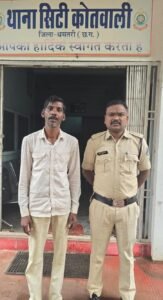 नाम आरोपी-: तोरण महार पिता स्व० किशन महार उम्र 40 वर्ष सा० स्टेशन पारा धमतरी थाना सिटी कोतवाली, जिला धमतरी(छ.ग.) उक्त कार्यवाही में थाना सिटी कोतवाली प्रआर.सौरभ पटेल,आरक्षक,डायमंड यादव, मुकेश सिन्हा का विशेष योगदान रहा।