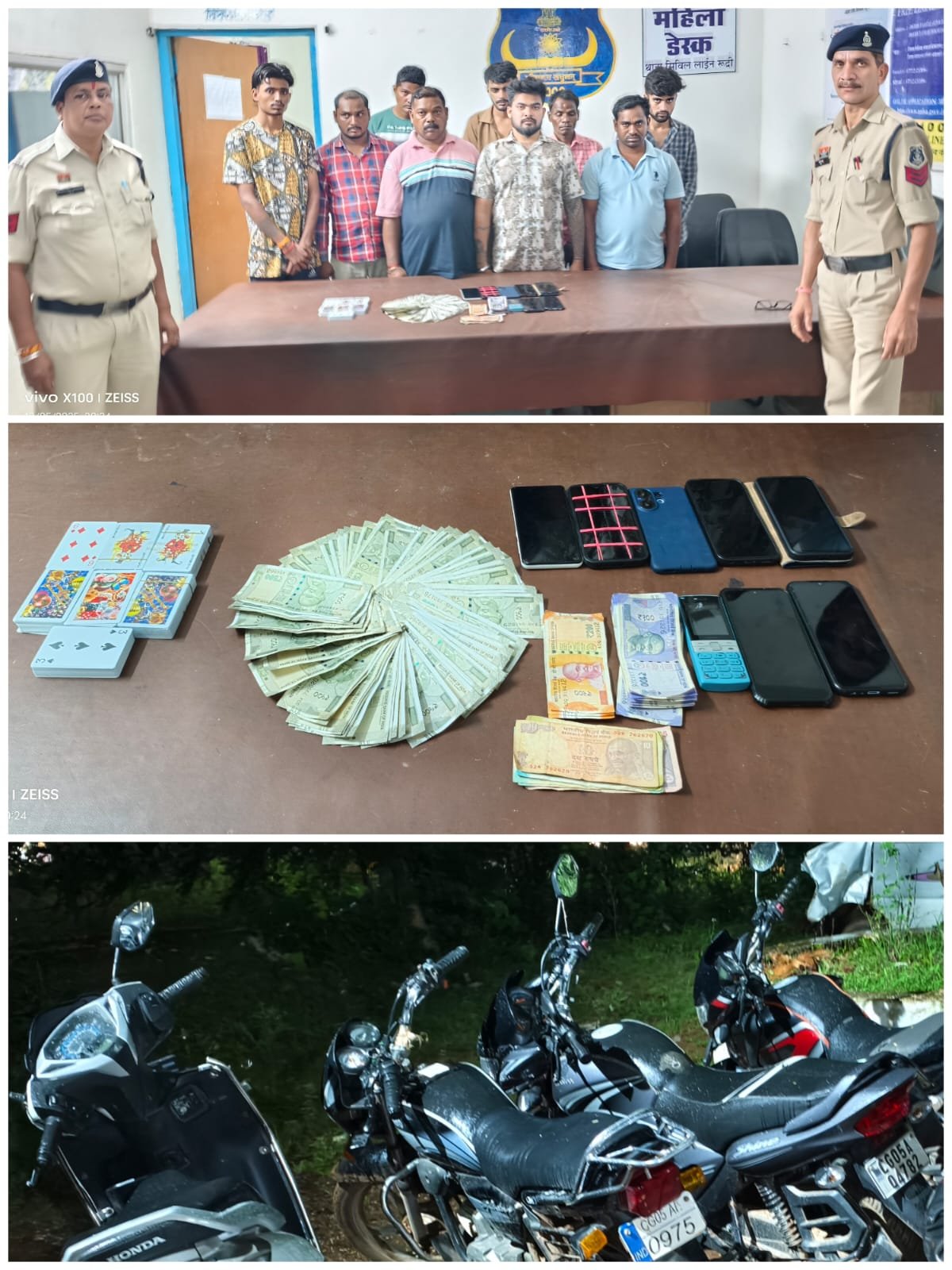 पकड़े गए जुआरियों से 40,200/- रुपये नगद, 01 बंडल ताश पत्ती 52 पत्ती, 01 नग पीला रंग की तालपत्री, 07 स्मार्टफोन एवं 01 कीपैड मोबाइल कुल कीमती 1,00,000/-, 03 मोटरसाइकिल एवं 01 स्कूटी (कुल 04 वाहन) कीमती 1,20,000/-रूपये ,इस प्रकार कुल जुमला 2,60,200/- रूपये की सामग्री जप्त की गई। वैधानिक कार्यवाही -: जप्तशुदा रकम एवं सामान के संबंध में थाना रूद्री में आरोपियों के विरुद्ध धारा 03(2) छत्तीसगढ़ जुआ (प्रतिषेध) अधिनियम के तहत वैधानिक कार्यवाही की गई है।