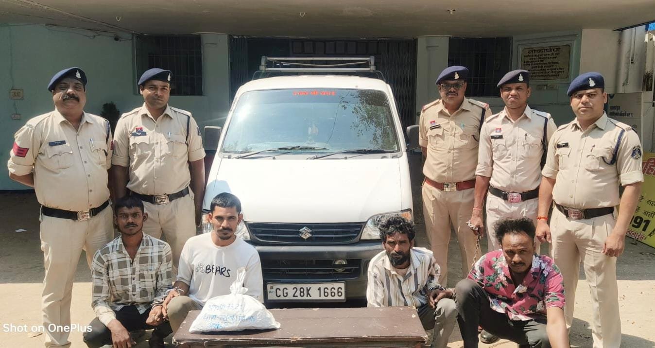 आरोपियों का नाम-: (01) दुर्गेश चंद्राकर पिता भागवत चंद्राकर उम्र 24 वर्ष साकिन बजरंग चौक कुरूद थाना कुरूद जिला धमतरी (02) अमित कुमार यादव पिता स्व० द्वारिका यादव उम्र 28 वर्ष साकिन गोड़पेण्ड्री थाना उतई जिला दुर्ग (छ.ग.) (03) राकेश मारकंडे पिता विरेन्द्र मारकंडे उम्र 23 वर्ष साकिन गोड़पेण्ड्री थाना उतई जिला दुर्ग (छ.ग.) (04) भुनेश्वर प्रसाद साहू पिता संतोष साहू उम्र 25 वर्ष साकिन गोड़पेण्ड्री थाना उतई जिला दुर्ग (छ.ग.) का कृत्य धारा 22 (ख) नारकोटिक एक्ट का पाये जाने से अपराध पंजीबद्ध कर आरोपीगण को धमतरी पुलिस द्वारा लगातार अवैध शराब जुआ सट्टा,नशीली दवाई एवं अवैध कारोबारियों के विरुद्ध वैधानिक कार्यवाही की जा रही है। उक्त कार्यवाही मे थाना कुरूद से सउनि.कमिलचंद सोरी, प्रआर० जयप्रकाश कन्नौजे, महेश साहू हेमंत सिन्हा, त्रिवेंद्र सिरमौर सहित थाना कुरूद का विशेष योगदान रहा।