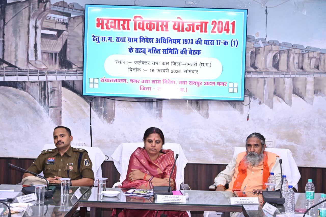 धमतरी | छत्तीसगढ़ नगर तथा ग्राम निवेश द्वारा तैयार किए जा रहे भखारा विकास योजना (प्रारूप) 2041 के संबंध में गठित समिति की बैठक सोमवार को कलेक्टोरेट सभाकक्ष में आयोजित की गई। बैठक की अध्यक्षता महासमुंद लोकसभा क्षेत्र की सांसद श्रीमती रूपकुमारी चौधरी ने की। इस अवसर पर सांसद कांकेर लोकसभा क्षेत्र श्री भोजराज नाग, जिला पंचायत अध्यक्ष श्री अरूण सार्वा, जनपद अध्यक्ष कुरूद श्रीमती गीतेश्वरी साहू, विधायक प्रतिनिधि श्री हरखलाल जैन, नगर पंचायत उपाध्यक्ष श्रीमती ज्योति जैन, भखारा निवेश क्षेत्र में सम्मिलित ग्रामों के सरपंच, पुलिस अधीक्षक श्री सूरज सिंह परिहार, अपर कलेक्टर श्रीमती इंदिरा देवहारी सहित नगर तथा ग्राम निवेश के अधिकारी उपस्थित रहे। बैठक में सांसद श्रीमती चौधरी ने कहा कि भखारा क्षेत्र के संतुलित एवं समग्र विकास के लिए दीर्घकालीन योजना अत्यंत आवश्यक है। उन्होंने जोर देकर कहा कि विकास योजना तैयार करते समय स्थानीय नागरिकों की आवश्यकताओं, आधारभूत सुविधाओं के विस्तार, रोजगार सृजन तथा पर्यावरण संरक्षण को प्राथमिकता दी जाए। साथ ही अधिकारियों को निर्देशित किया कि योजना का वास्तविक लाभ आमजन तक पहुंचे और क्षेत्र को सुव्यवस्थित एवं आधुनिक स्वरूप प्रदान किया जाए। अधिकारियों ने जानकारी दी कि भखारा क्षेत्र के नियोजित विकास के लिए छत्तीसगढ़ नगर तथा ग्राम निवेश अधिनियम 1973 की धारा 17(1) के तहत समिति का गठन किया गया है। प्रस्तावित योजना में कुल 25 ग्रामों को शामिल किया गया है, जिनका कुल क्षेत्रफल लगभग 12276.90 हेक्टेयर है। वर्ष 2041 की अनुमानित 90 हजार जनसंख्या को आधार मानकर विकास की रूपरेखा तैयार की गई है। योजना यूआरडीपीएफआई 2015 के दिशा-निर्देशों के अनुरूप तैयार की गई है, जिसमें आवासीय, वाणिज्यिक, औद्योगिक, सार्वजनिक एवं अर्धसार्वजनिक उपयोग, आमोद-प्रमोद, परिवहन, सार्वजनिक उपयोगिता तथा मिश्रित उपयोग के लिए भूमि आरक्षण का प्रस्ताव शामिल है। इसके अलावा वर्तमान आवश्यकताओं को ध्यान में रखते हुए नए मार्गों के विस्तार एवं सुदृढ़ीकरण का भी प्रावधान किया गया है। बैठक में समिति के सदस्यों द्वारा प्रस्तुत प्रारूप पर विस्तृत चर्चा की गई तथा प्राप्त सुझावों को योजना में समाहित करने पर सहमति बनी। निर्धारित प्रक्रिया के अनुसार आपत्तियां एवं सुझाव प्राप्त करने के पश्चात विकास योजना (प्रारूप) 2041 का प्रकाशन किया जाएगा।