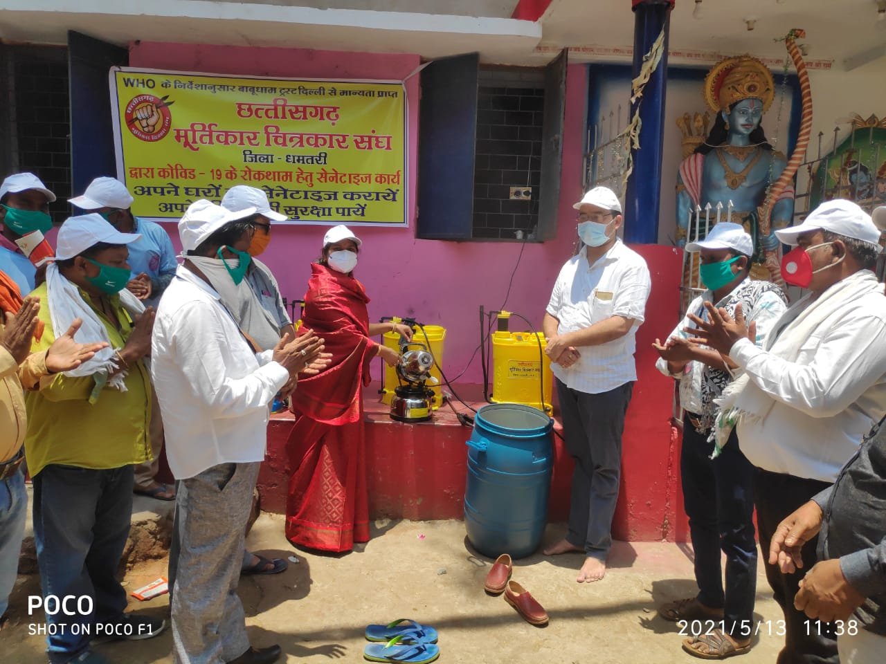 लाल बगीचा वार्ड में प्रभु श्री राम एवं भक्त हनुमान जी के पूजा अर्चना कर धमतरी शहर में सेनेटाइजर करने जिला मूर्तिकार चित्रकार संघ को विधायक रंजना साहू, नेता प्रतिपक्ष नरेंद्र रोहरा, जिला भाजपा कोषाध्यक्ष चेतन हिंदूजा, पार्षद बिसेन निषाद की उपस्थिति में सौंपा गया पीपीटी किट, मास्क, सैनिटाइजर, हैंड ग्लब्स।
