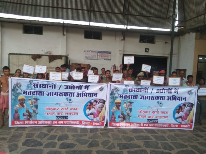धमतरी | कलेक्टर एवं जिला निर्वाचन अधिकारी ऋतुराज रघुवंशी के निर्देश पर और सीईओ जिला पंचायत एवं स्वीप जिला नोडल अधिकारी श्रीमती रोक्तिमा यादव के मार्गदर्शन में आगामी विधानसभा चुनाव 2023 की तैयारियां जिले में जोर पकड़ रहीं हैं। इसके तहत स्कूल, कॉलेज ऑयल और राइस मिलों सहित विभिन्न विभागों के शिविरों और बैठकों में मतदाता जागरूकता अभियान चलाया जा रहा है। इसी कड़ी में गत दिनों मतदाता जागरूकता अभियान के तहत अतुल राइस मिल में कार्यरत कर्मचारियों को मतदान के लिए जागरूक करते हुए स्लोगन के माध्यम से जागरूक कर शपथ दिलाया गया।