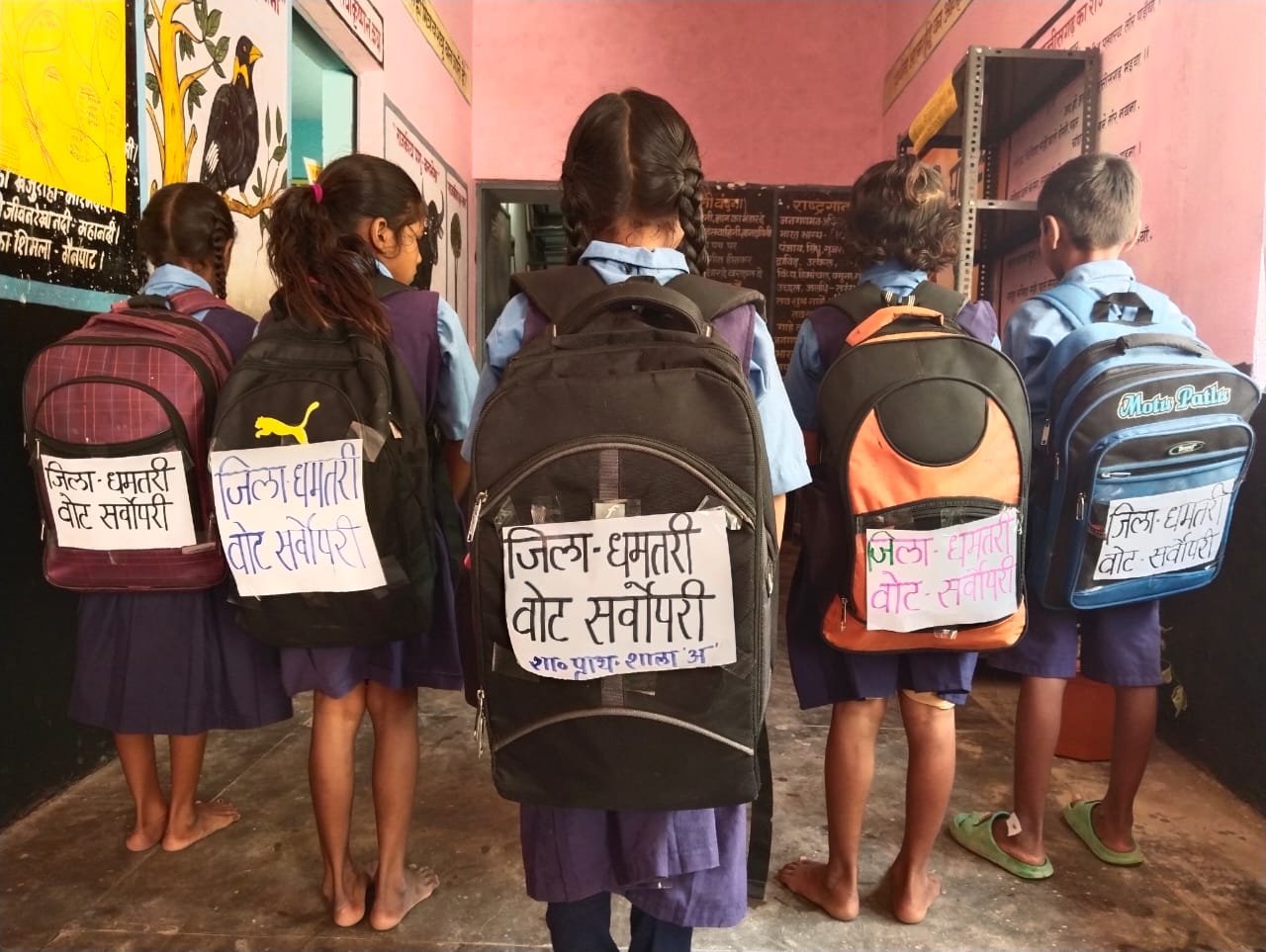 इसी कड़ी में मतदाता जागरूकता अभियान को घर घर पहुंचने जिला प्रशासन द्वारा एक अनूठा प्रयोग किया जा रहा है, जिसमे स्कूली बच्चो के स्कूल बैग के पीछे मतदान के प्रति लोगो को जागरूक करने स्लोगन, नारा आदि लगाया जा रहा है। बच्चे स्कूल आते जाते, घर या आस पास के लोगो को मतदान का महत्व व जिला धमतरी वोट सर्वोपरि का संदेश देते दिखाई देंगे। जिले में लोकतंत्र के महापर्व में अब बच्चे भी अपनी महत्वपूर्ण भूमिका निभा रहे है।