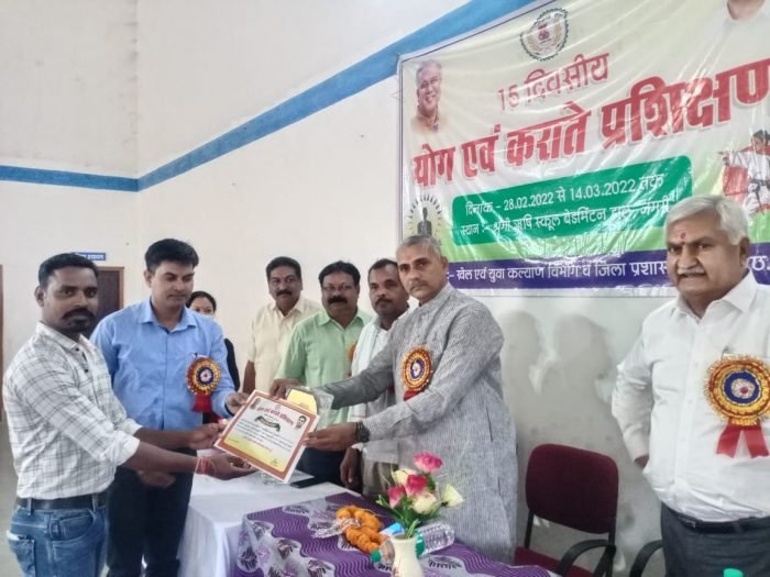 नगरी -धमतरी | वनांचल क्षेत्र विकासखंड नगरी में खेल एवं युवा कल्याण विभाग तथा शिक्षा विभाग नगरी के संयुक्त तत्वावधान में कलेक्टर पी.एस.एल्मा के मार्गदर्शन में 28 फरवरी से 14 मार्च 2022 तक इंडोर स्टेडियम नगरी में आयोजित किये गए विकासखंड स्तरीय “योग एवं कराटे प्रशिक्षण शिविर” का समापन 14 मार्च को ज्ञानेश शर्मा अध्यक्ष छत्तीसगढ़ योग आयोग के मुख्य आतिथ्य में संपन्न हुआ | इस अवसर पर मुख्य अतिथि ज्ञानेश शर्मा अध्यक्ष छत्तीसगढ़ योग आयोग (राज्य मंत्री दर्जा प्राप्त) ने प्रशिक्षार्थियों एवं उपस्थित नागरिकों विशेष रूप से छात्र-छात्राओं एवं युवाओं को संबोधित करते हुए दैनिक जीवन में योग को आत्मसात कर अपने सुनहरे भविष्य का निर्माण करने को कहा |