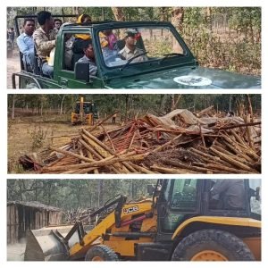 उदंती सीता नदी अभ्यारण क्षेत्र के अरसीकन्हार रेंज स्थित घोरागांव के 26 परिवारों ने 15 हेक्टेयर वन भूमि के करीब डेढ़ हजार पेड़ काटकर 26 झोपड़िया बना ली थी। वन विभाग ने ड्रोन सर्वे किया तो इसका खुलासा हुआ। इसके बाद वन विभाग ने कब्जा धारियों को तीन बार नोटिस दिया जवाब नहीं मिलने पर मंगलवार को वन विभाग के अफसरों ने राजस्व और पुलिस के साथ मिलकर 9:00 से 6:00 बजे तक अतिक्रमण हटाया जंगल से काटे गए पेड़ों से हीचौकड़िया बनाई थी। वन विभाग से बचने मिट्टी का लेप लगा दिया गया था ऐसा कर जंगल में अतिक्रमण किया था ।