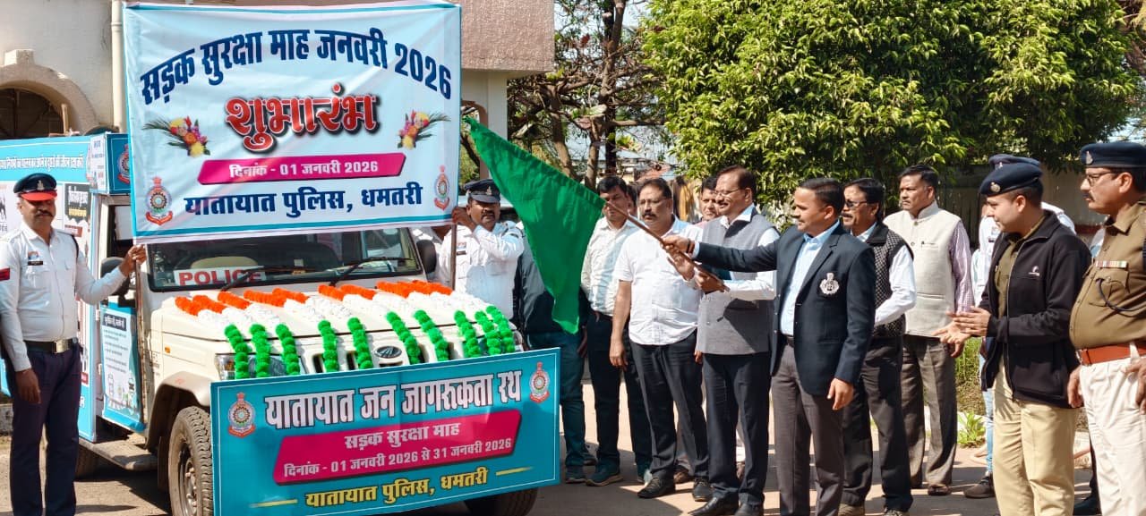 धमतरी | धमतरी में शुरू हुआ सड़क सुरक्षा जागरूकता अभियान – ‘सड़क सुरक्षा : पूरे माह जीवन रक्षा’ का संदेश पहुंचेगा जन-जन तक ,  यातायात नियमों के प्रति जागरूकता बढ़ाने विशेष रथ अभियान – जिले के शहरी व ग्रामीण क्षेत्रों में 01 माह तक चलेगा यह अभियान, धमतरी जिले में सड़क सुरक्षा माह- 2026 के तहत सड़क दुर्घटनाओं की रोकथाम एवं आम नागरिकों में यातायात नियमों के प्रति जागरूकता बढ़ाने के उद्देश्य से यातायात जनजागरूकता रथ अभियान का शुभारंभ किया गया। कार्यक्रम के दौरान एसपी.धमतरी श्री सूरज सिंह परिहार द्वारा रथ को हरी झंडी दिखाकर रवाना किया गया, जिसके साथ ही सड़क सुरक्षा माह की औपचारिक शुरुआत हुई।