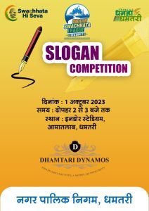धमतरी l नगर निगम धमतरी द्वारा स्वच्छता पखवाड़ा अंतर्गत विविध कार्यक्रम आयोजित किए जा रहे जिसमे सभी उम्र के प्रतिभाशाली प्रतिभागी भाग ले सकते हैं जिसके लिए नगर निगम द्वारा बेहद रूप से प्रचार-प्रसार किया जा रहा है। साथ ही महापौर विजय देवांगन ने प्रतिभागियों से अपील किया है कि ज्यादा से ज्यादा संख्या में प्रतिभागी भाग लेकर स्वच्छता के प्रति अपनी जागरूकता दिखाएं ताकि आम नागरिकों में भी स्वच्छता के प्रति जागरूकता आए।