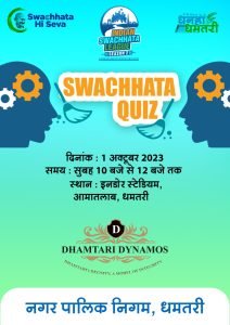 1 अक्टूबर को आमा तालाब समीप इंडोर स्टेडियम में सुबह 10:00 बजे से 12:00 तक स्वच्छता क्विज का आयोजन किया गया है,तत्पश्चात स्लोगन कंपटीशन भी दोपहर 2:00 बजे से 3:00 बजे तक आयोजित की जाएगी।
