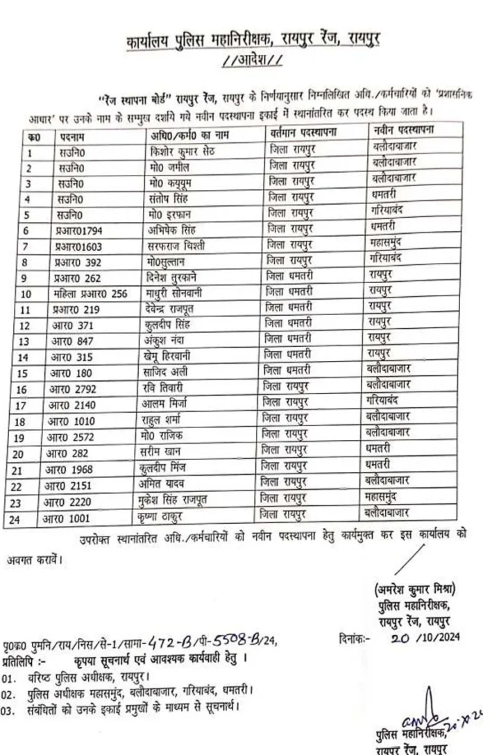 जारी आदेशानुसार सहायक उपनिरीक्षक किशोर कुमार सेठ को रायपुर से बलौदाबाजार, मो.जमील रायपुर से बलौदाबाजार, मो. कय्यूम रायपुर से बलौदाबाजार, संतोष सिंह रायपुर से धमतरी, मो. इरफान रायपुर से गरियाबंद, प्रधान आरक्षकों में अभिषेक सिंह रायपुर से धमतरी, सरफराज चिश्ती रायपुर से महासमुंद, मो. सुल्तान रायपुर से गरियाबंद, दिनेश तुरकाने धमतरी से रायपुर, महिला प्रधान आरक्षक माधुरी सोनवानी धमतरी से रायपुर, देवेन्द्र राजपूत धमतरी से रायपुर, आरक्षकों में कुलदीप सिंह धमतरी से रायपुर, अंकुश नंदा धमतरी से रायपुर, खेमू हिरिवानी धमतरी से रायपुर, साजिद अली धमतरी से बलौदाबाजार, रवि तिवारी रायपुर से बलौदाबाजार, आलम मिर्जा रायपुर से गरियाबंद, राहुल शर्मा रायपुर से बलौदाबाजार, मो.राजिक रायपुर से बलौदाबाजार, सरीम खान रायपुर से धमतरी, कुलदीप मिंज रायपुर से धमतरी, अमित यादव रायपुर से बलौदाबाजार, मुकेश सिंह राजपूत रायपुर से महासमुंद, कृष्णा ठाकुर बलौदाबाजार पोस्टेड किया गया है।